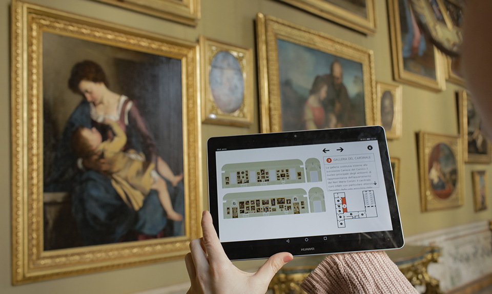 Ai visitatori viene fornito il tablet dal quale fruire l’applicazione, che è disponibile in tre lingue (italiano, inglese e francese) e prevede differenti livelli di approfondimento. In questo modo la visita del museo diventa più agevole, fluida e completa: i visitatori possono esplorare la storia delle collezioni, del palazzo e della famiglia Corsini e, allo stesso tempo, orientarsi tra le sale dell’appartamento del cardinale Neri Maria Corsini, identificando gli oltre trecento dipinti esposti, riprodotti con un’immagine ad alta definizione per poterne apprezzare i dettagli che, per la particolarità dell’allestimento, non sono facilmente visibili. Cinquanta opere sono poi, corredate da uno specifico approfondimento che permette di scoprirne la storia e le particolarità.